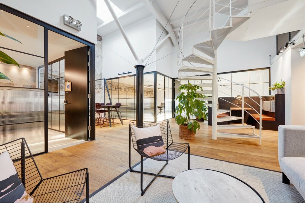 Steven says: This workspace in Leith is one of the city’s most distinctive flexible workspaces, blending contemporary design with the character and heritage of Leith’s historic waterfront. Located in Commercial Quay, the building was originally a bonded warehouse, and its transformation into a modern workspace has been carried out with exceptional care. Period features such as block windows, exposed wooden beams, and original brickwork have been thoughtfully restored, giving the space a unique charm that sets it apart from more conventional office environments. And yes there is an onsite bar!