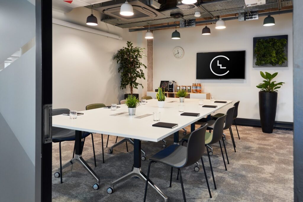 The interior design of the meeting rooms is modern, bright, and welcoming. Many rooms benefit from natural light and views across Glasgow’s skyline, creating an energising atmosphere that helps keep teams focused and engaged. Comfortable seating, spacious layouts, and well‑designed breakout areas contribute to a productive working environment.